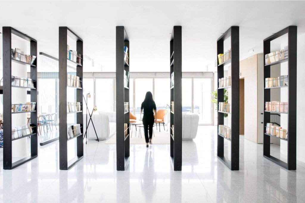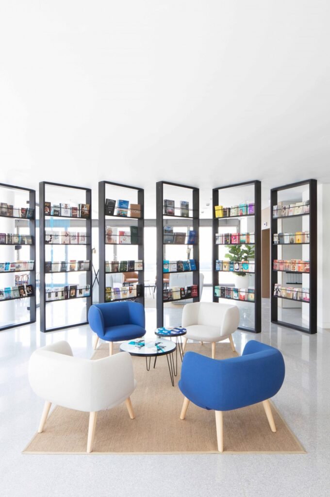 The interiors draw inspiration from books, art, and storytelling, realized through layered textures, sculptural shelving, curated artwork, and warm, inviting materials. The space fosters an environment that is simultaneously social, intellectual, and visually engaging.